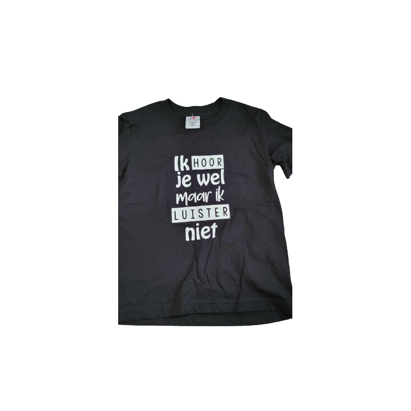 Zwart shirt met leuke opdruk; ik hoor je wel, maar ik luister niet