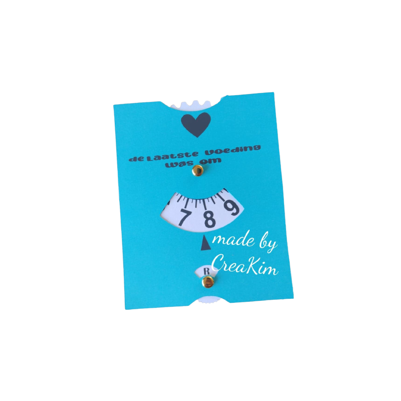 Voedingskaart, heel erg handig om te onthouden wanneer je kindje voor het laatst voeding heeft gehad. Draai hem simpelweg op het uur, en iedereen kan zien wanneer de laatste voeding is geweest. Leverbaar in neutrale, jongens of meisjes kleuren. Vermeld bij je bestelling gerust de voorkeur.