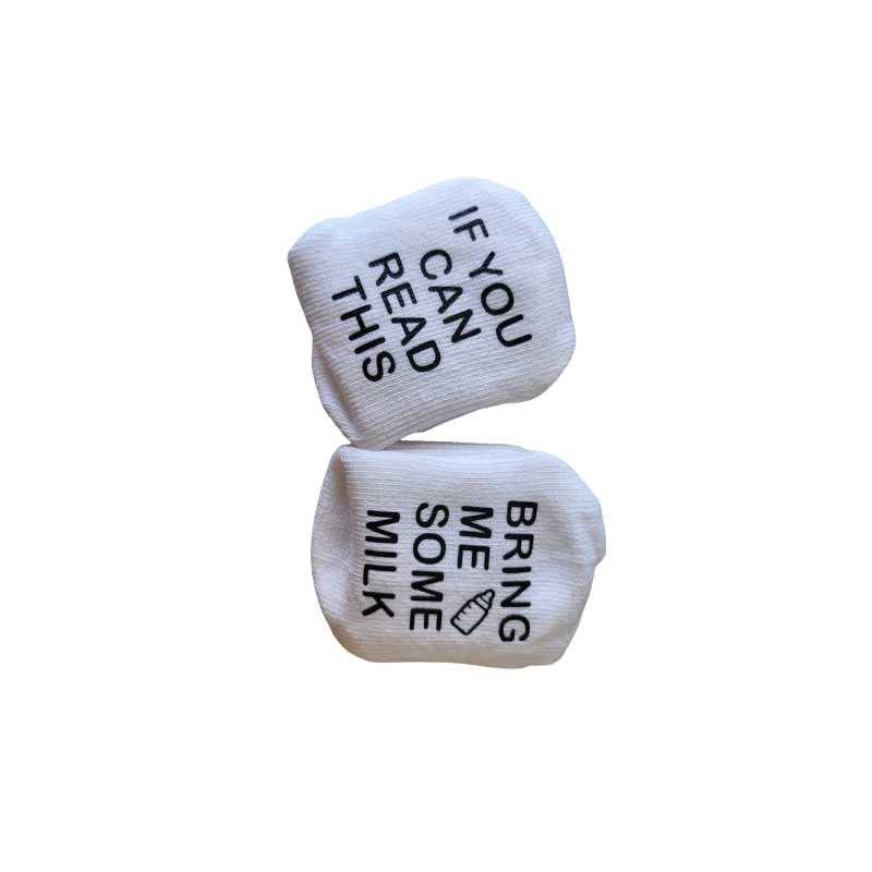 Babysokjes maat 86-92. De zooltjes zijn voorzien van een grappige tekst.