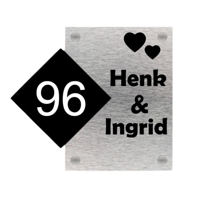 Naambordje met huisnummer. Gemaakt van RVS look en zwart plexiglas. Met RVS afstandshouders, schroeven en pluggen.