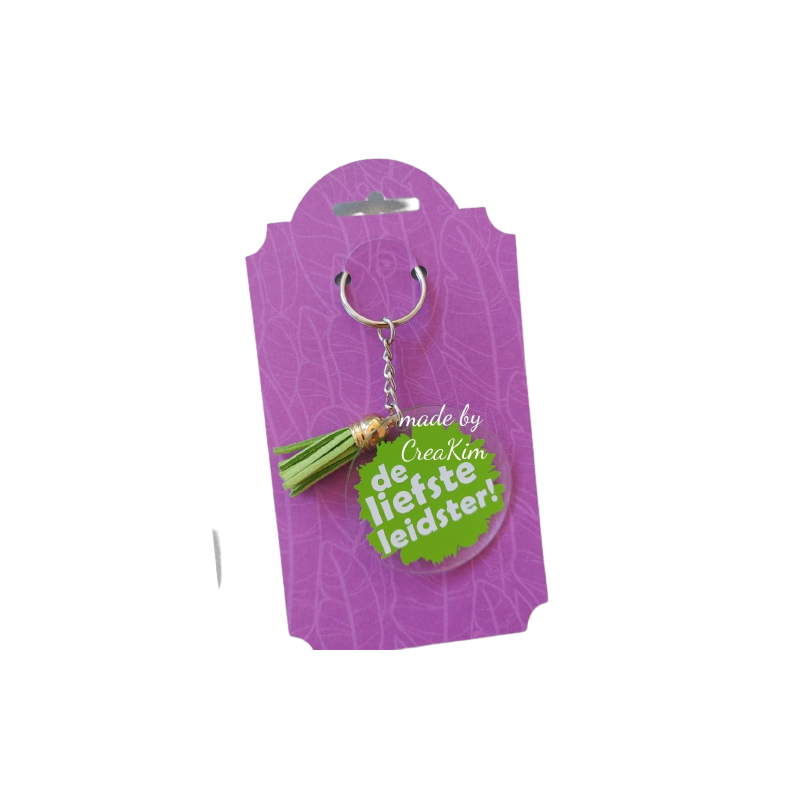 Plexiglas sleutelhanger voor de liefste leidster. Uiteraard ook mogelijk met andere teksten. Kleuren worden assorti geleverd.