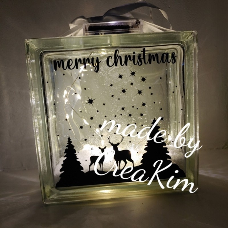 Glasblok, met kerst bedrukking en lampjes (werken op batterijen) erin. Eventueel met een mooie strik erom, en nepsneeuw in het glasblok.
