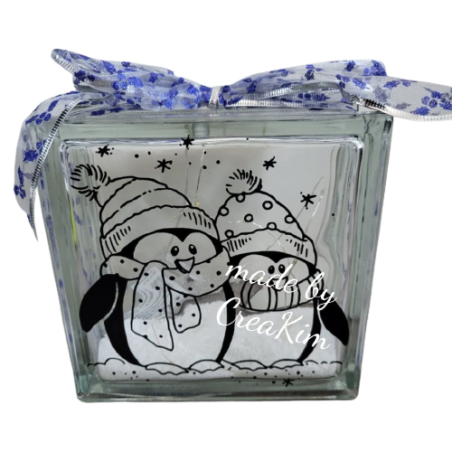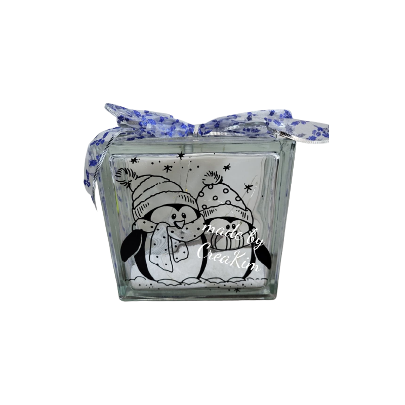 Glasblok, met kerst bedrukking en lampjes (werken op batterijen) erin. Eventueel met een mooie strik erom, en nepsneeuw in het glasblok.