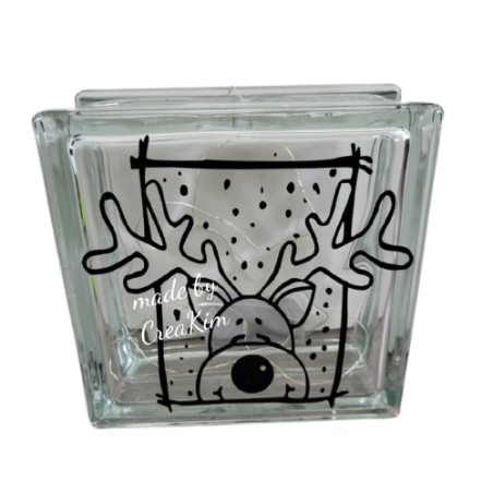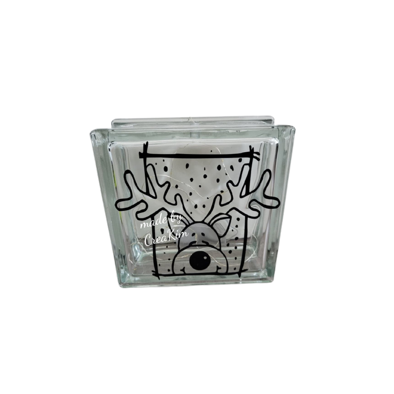 Glasblok, met kerst bedrukking en lampjes (werken op batterijen) erin. Eventueel met een mooie strik erom, en nepsneeuw in het glasblok.