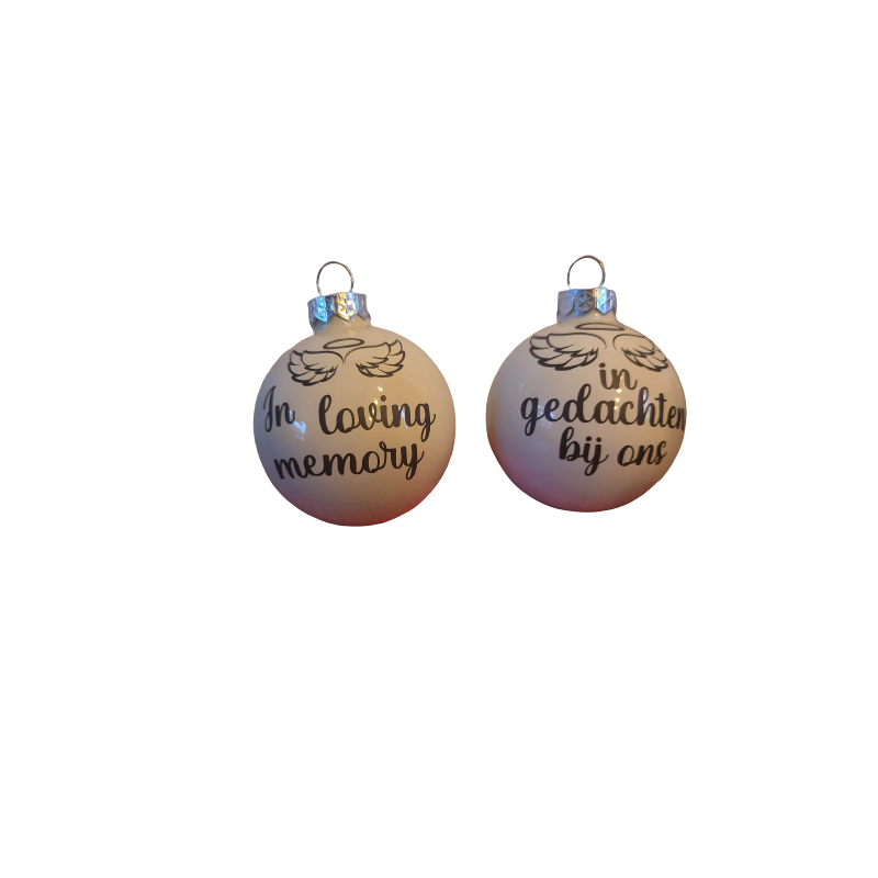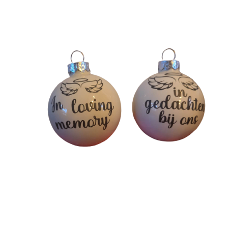 Glazen kerstbal met een in memoriam tekst. In meerdere kleuren leverbaar.