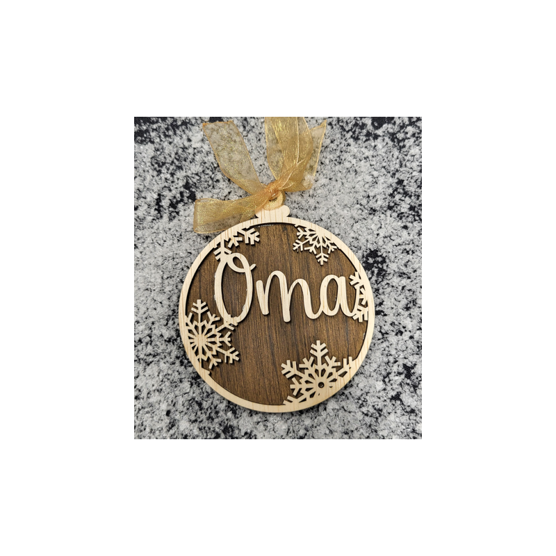 Mooie houten kerstbal met tekst; Oma. Inclusief assorti kleur strikje.