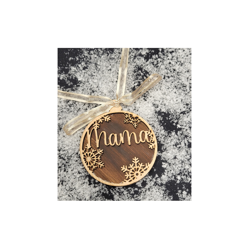 Mooie houten kerstbal met tekst; Mama. Inclusief assorti kleur strikje.