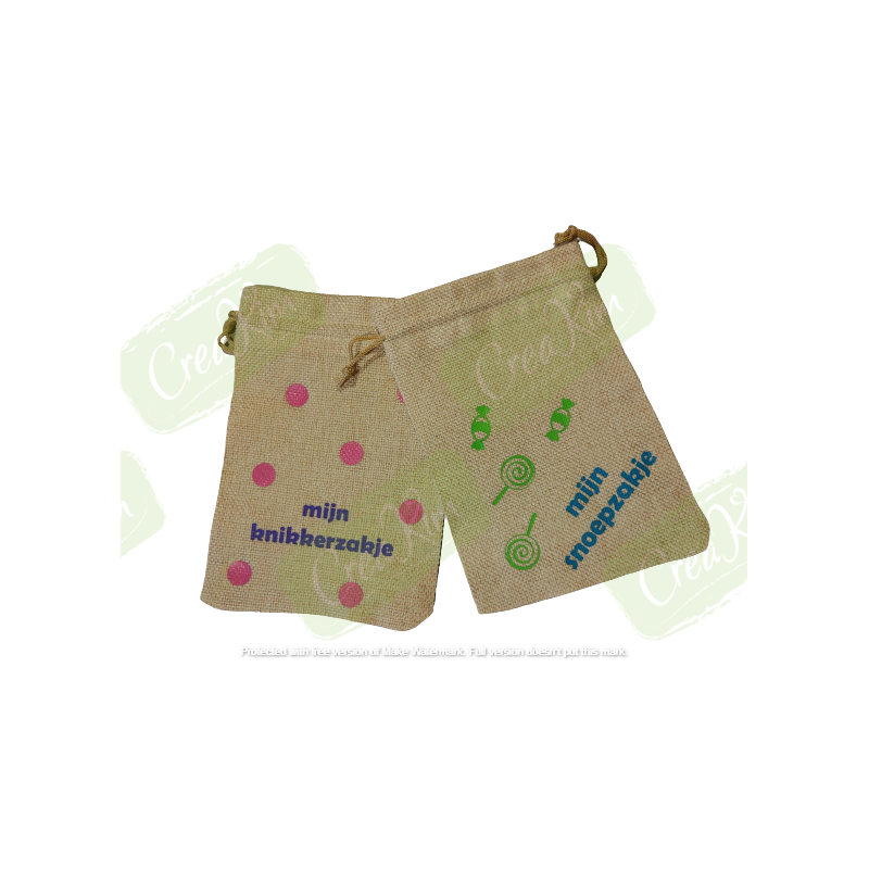 Jute zakje, mogelijk met bijvoorbeeld ''mijn snoepzakje of ''mijn knikkerzakje''.